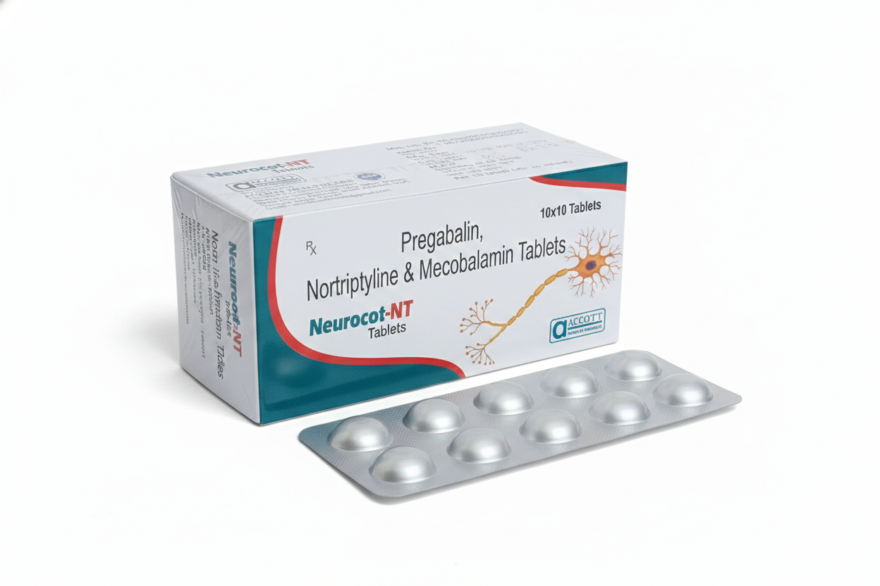 Neurocot-NT (Pregabalin, Nortriptyline & Mecobalamin) Neurocot-NT is a comprehensive therapeutic solution from Accott Healthcare for patients suffering from chronic neuropathic pain. This advanced triple-action formula combines Pregabalin to modulate overactive pain signals, Nortriptyline to enhance the body’s natural pain-inhibiting pathways, and Mecobalamin (Vitamin B12) to promote the repair of damaged nerve cells.